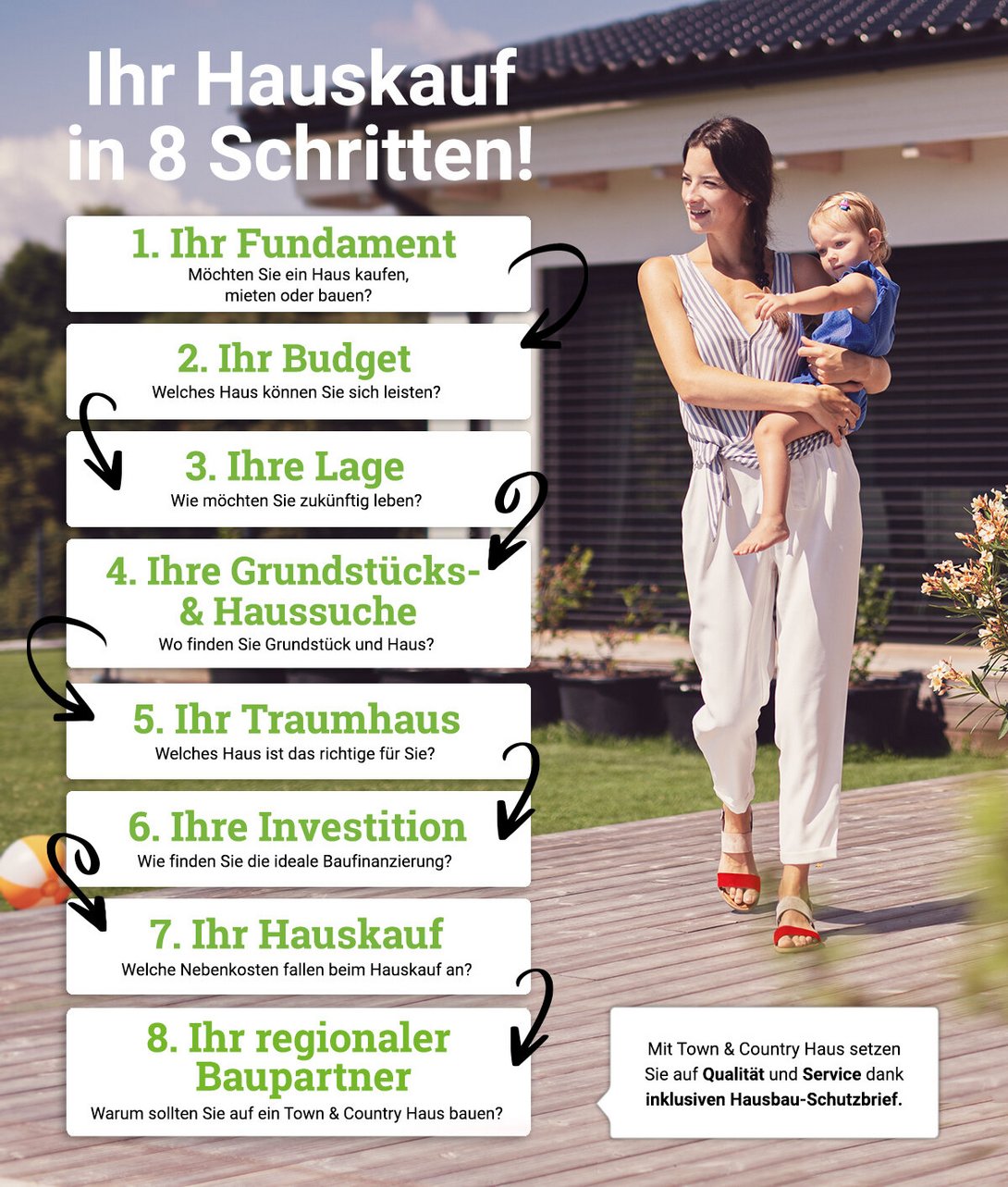 Alles aus einer Hand: Hier lesen Sie, dass nur 8 Schritte notwendig sind, um dem Traum vom eigenen Haus näher zu kommen. Sobald die Entscheidung getroffen ist und die Finanzierung steht, kann es zeitnah an die Umsetzung Ihres Hausbaus gehen. Mit Town & Country Haus wissen Sie einen erfahrenen und leistungsstarken Partner an Ihrer Seite, der Sie mit umfassenden Garantien begleitet, Sie bei der Grundstückssuche als auch bei der Baufinanzierung unterstützt.
